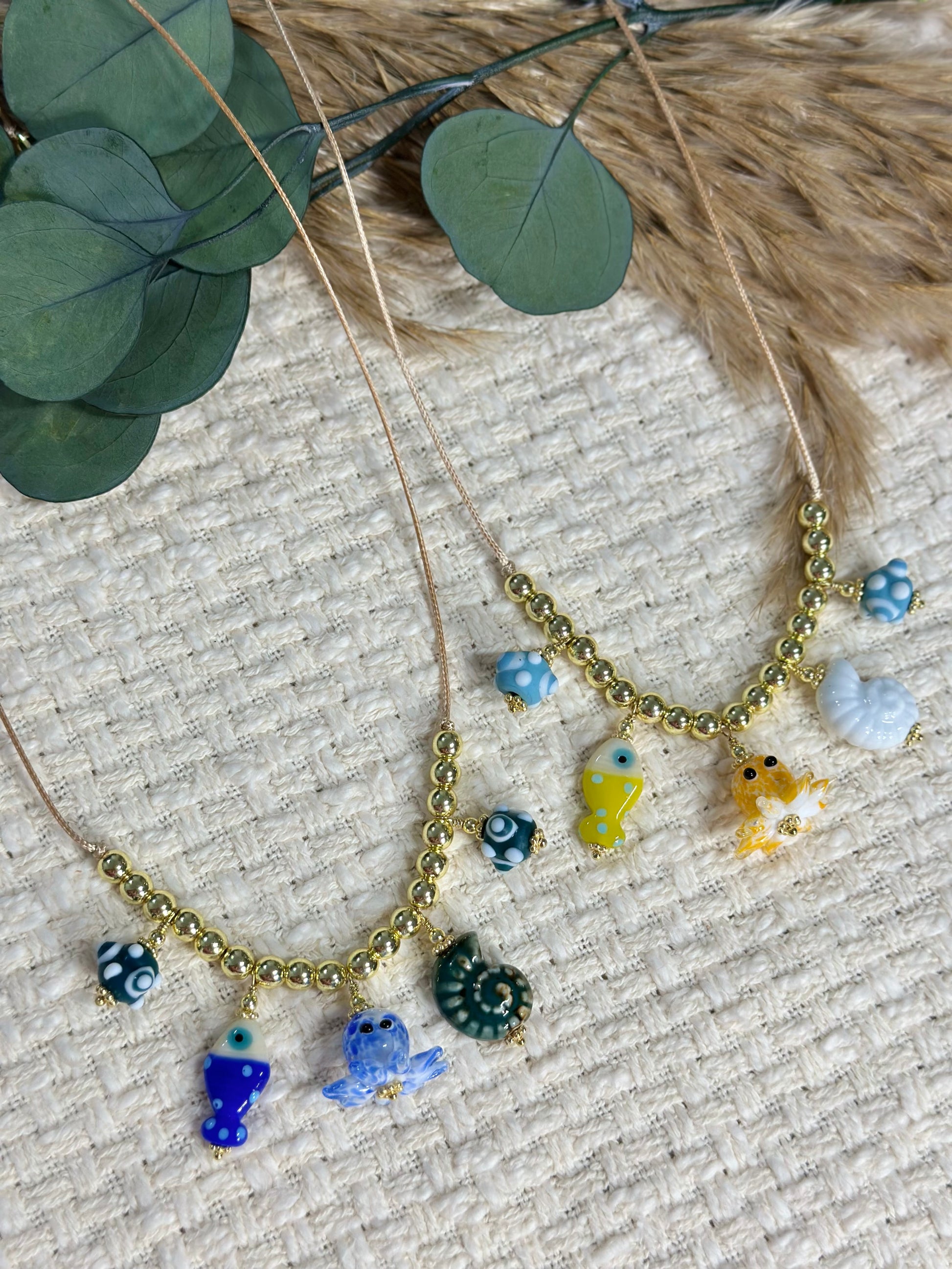 Collar en múltiples caídas en cristales múranos y porcelana, separadores enchapado en oro y hematitas.